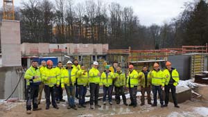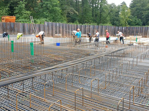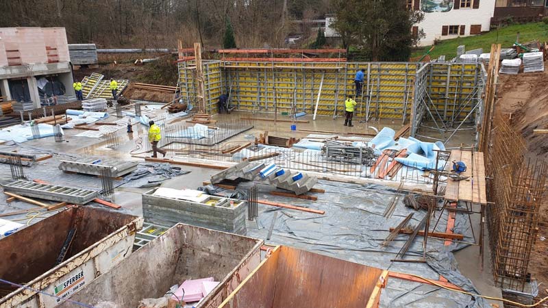 Zweiter Betonierabschnitt Bodenplatte und Beginn Aufbau der Kellerwände