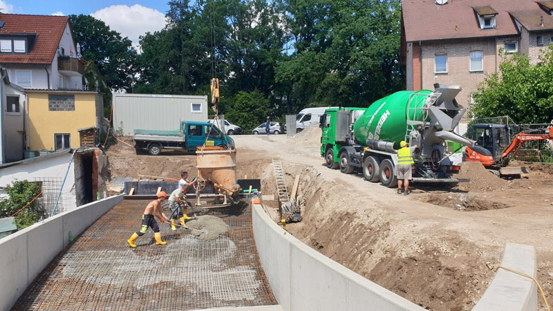 Einfahrt in die Tiefgarage mit Überfahrt fertig betoniert; Frühlingserwachen am neu gestalteten Ufer des Röthenbachs
